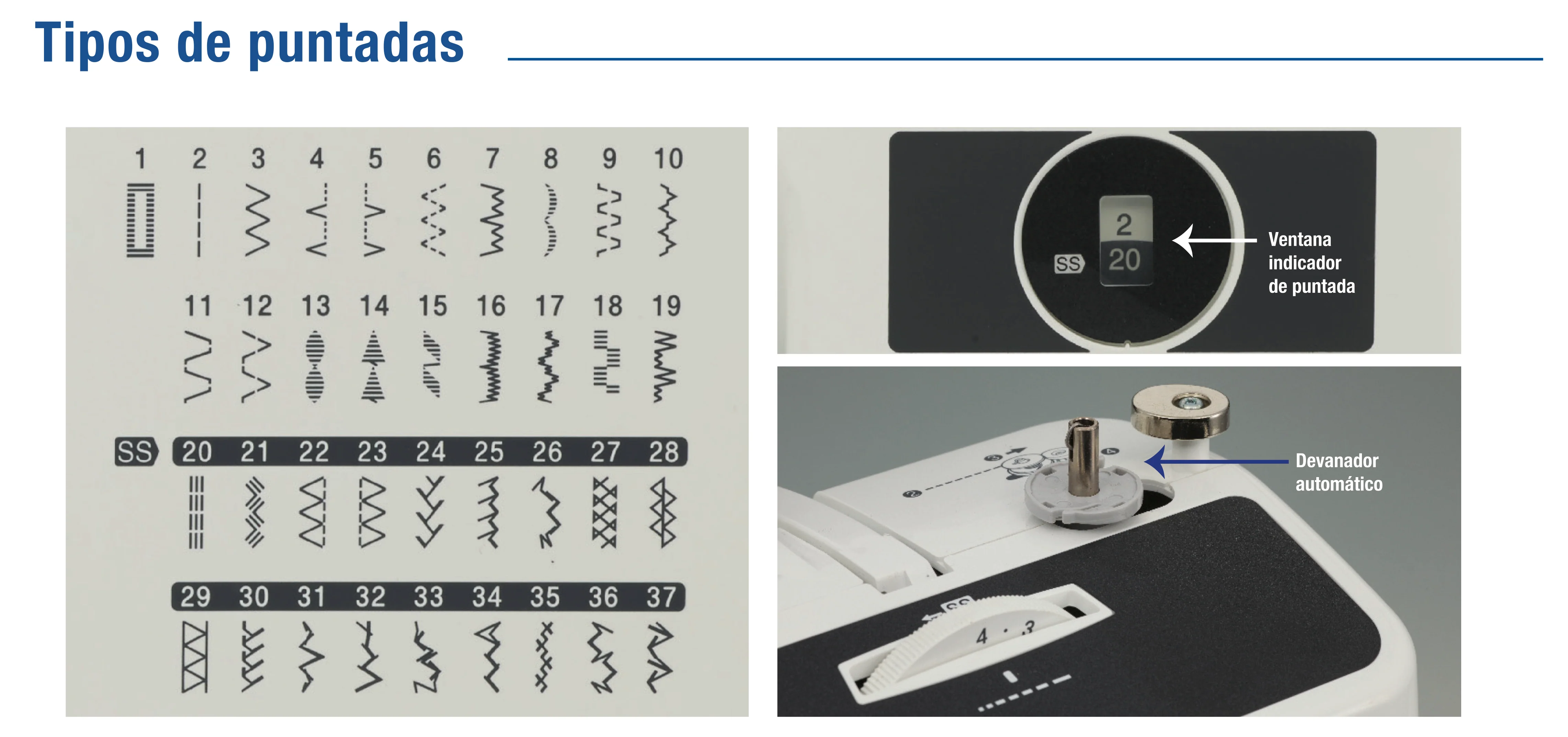 - 37 puntadas integradas únicas, incluyendo un ojal de tamaño automático de 1 paso
